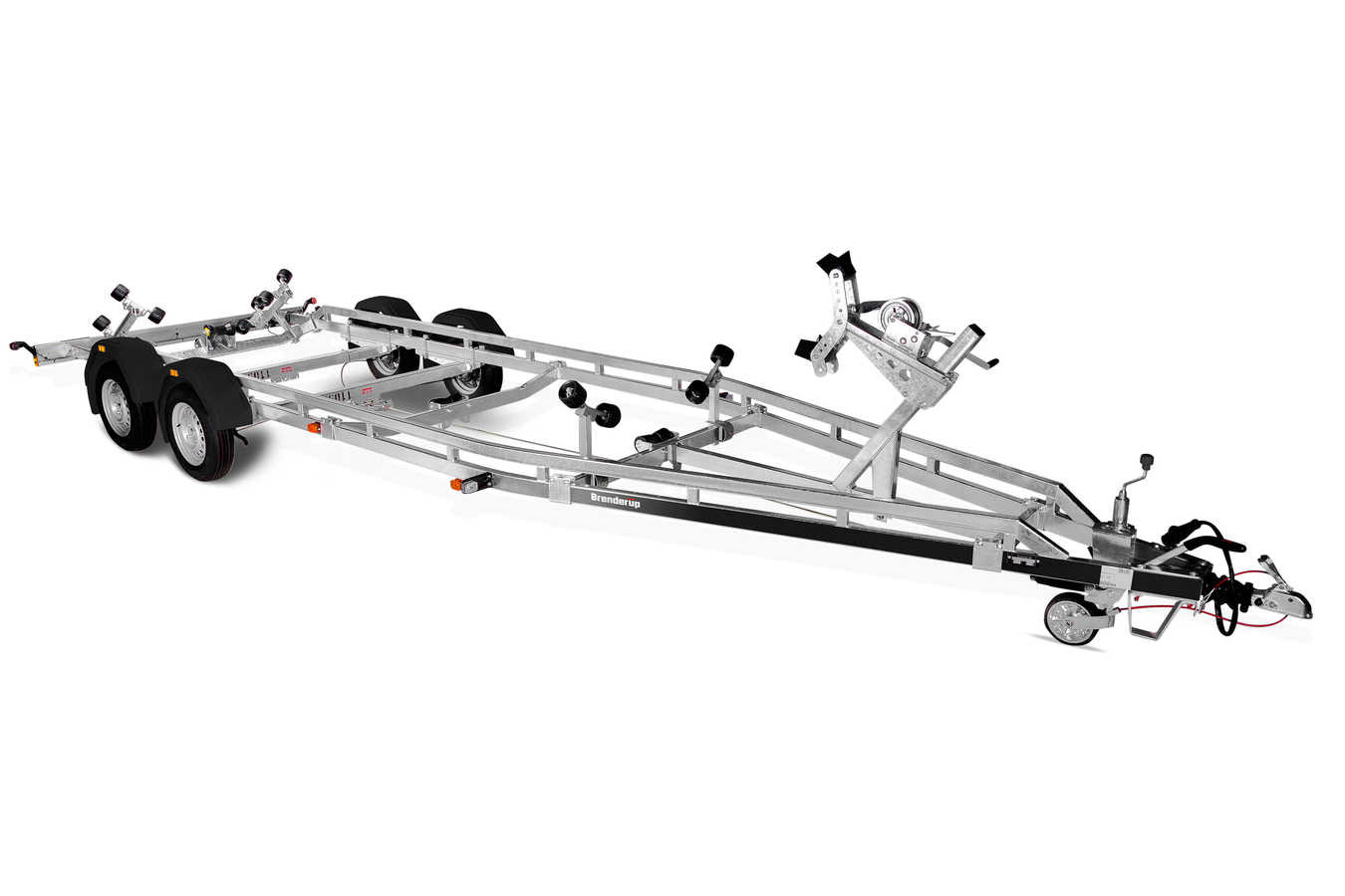 Bremset trailer med to aksler til både op til 24 fod. Traileren er udstyret med et forstærket V-formet chassis. Udstyret med superruller, forstærkede kølruller og justerbare dobbelte sideruller, som gør det nemt for dig at tilpasse traileren til din båd. Varmgalvaniseret chassis og vandtætte lejer for længere levetid og maksimal beskyttelse mod rust. Kablerne ligger beskyttet i trailerens chassis. Justerbart spil og spiltårn. Lystavlen sikrer let og hurtig søsætning af din båd, og lystavlen kan opbevares i bilens bagagerum under sejlturen. Traileren på billedet kan være vist med ekstraudstyr.