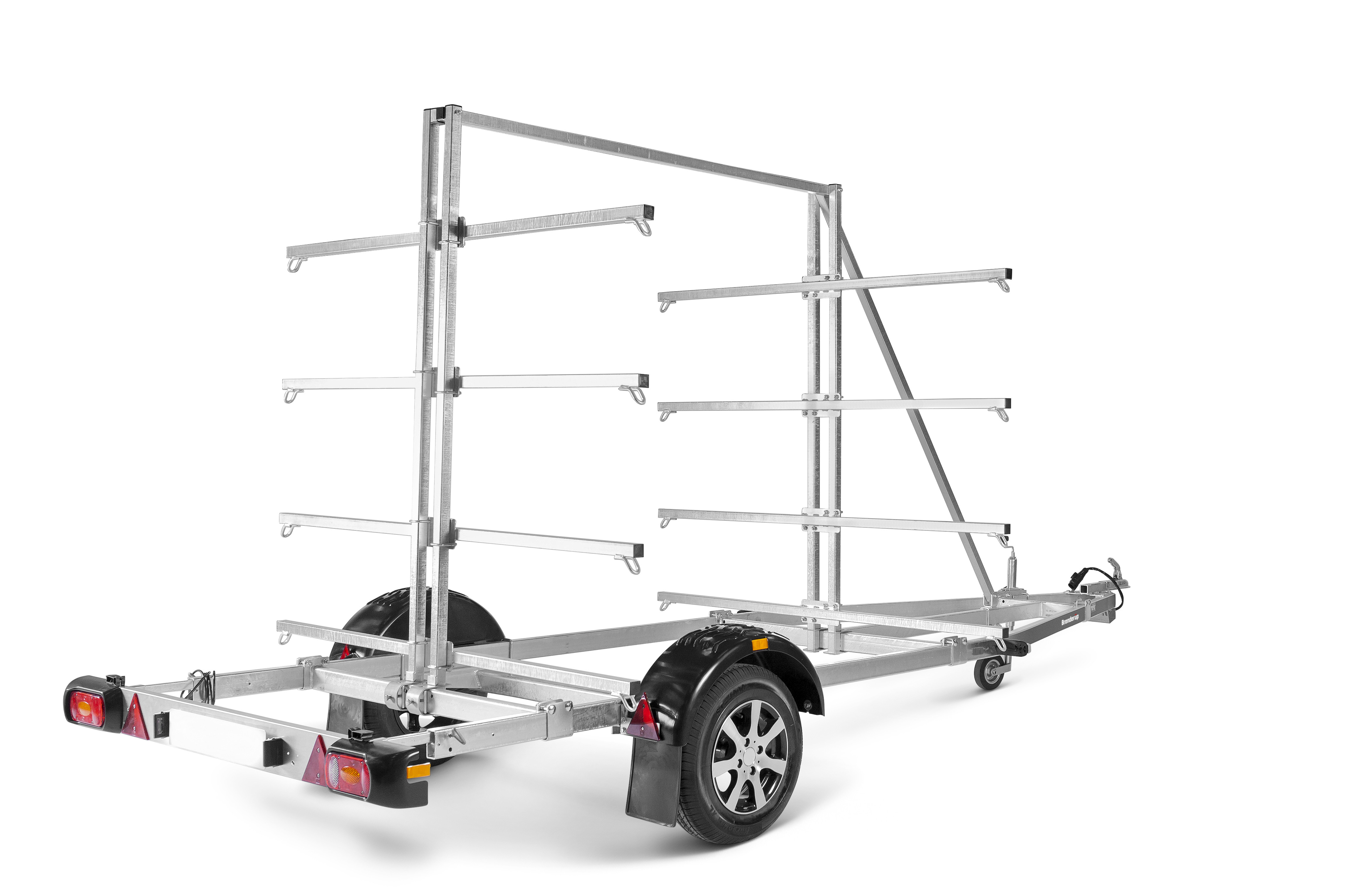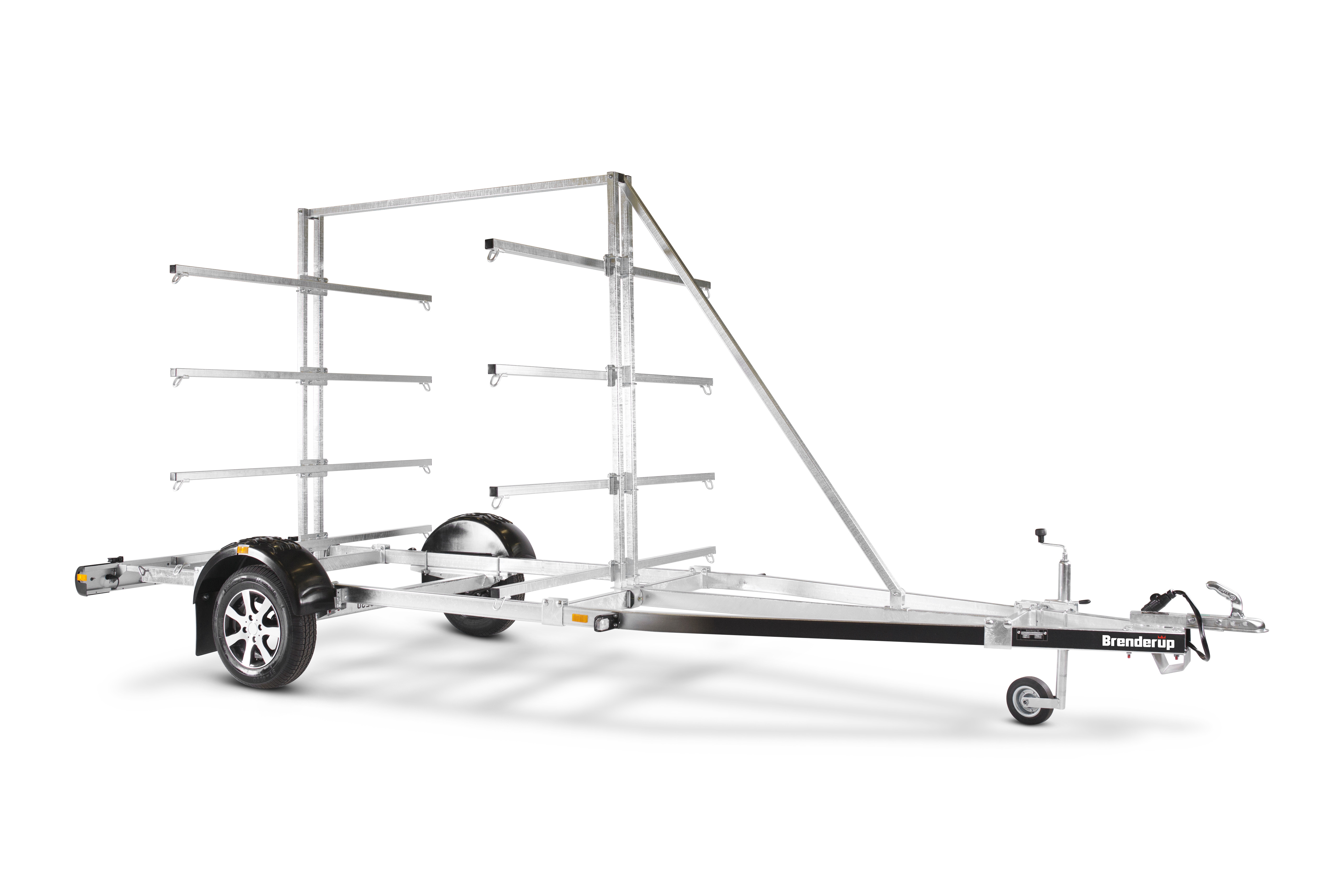 Med kano/kajaktraileren kan du let transportere op til 16 kajakker og 8 kanoer ad gangen. Stativet er justerbart afhængigt af størrelsen på dine kanoer/kajakker. Den V-formede trækstang giver en sikker og stabil transport af dine både. Varmgalvaniseret chassis og vandtætte lejer for længere levetid og maksimal beskyttelse mod rust. Kablerne ligger beskyttet i trailerens chassis. Lygtebommen sikrer let og hurtig søsætning af din båd, og lygtebommen kan opbevares i bilens bagagerum under sejlturen. Heldækkende skærme som trinbræt. Traileren på billedet kan være vist med ekstraudstyr.